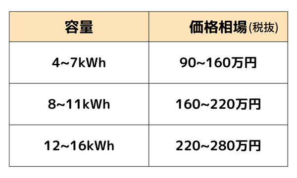 次に、蓄電池本体と工事費を合わせた価格相場をみてみましょう。
